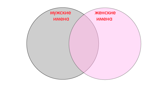 Заполни диаграммы Венна, перетащив имена в соответствующие множества. В области их пересечения расположи те имена, которые относятся как к мужским, так и к женским.