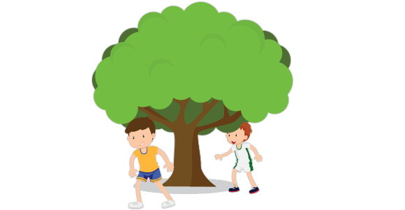 The boys are running _____ the tree.