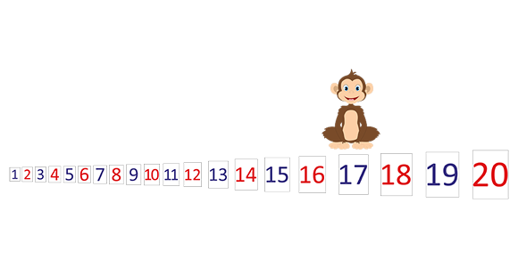 Обезьянка стояла над числом 17. Она сделала два прыжка влево. На каком по счёту числе она оказалась? Впиши это число в пустой квадратик.
