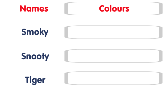 Fill in the colours of the cats in the table. What colour are the cats?